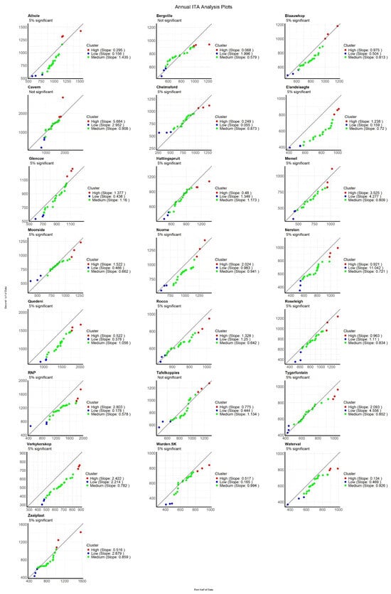 Out of the 22 weather stations’ annual trends, 7 stations (31.8%) exhibited significantly decreasing trends using the TFPWMK method, while 17 stations (72.3%) showed significantly decreasing trends using the ITA method (Figure 7e). The stations with significantly decreasing trends according to the ITA methodinclude the seven stations detected using the TFPWMK method. Both methods detected one station (Tafelkoppies) with a significantly increasing trend.