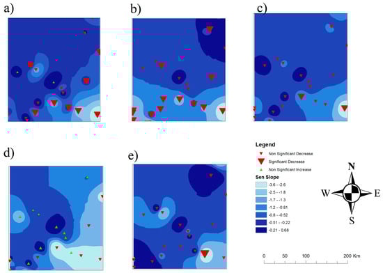 The median of the slope values is between xj and xi of t at time steps j, where (i < j). A positive value signifies a positive trend, while a negative value signifies a negative trend. The sign conveys the positive or negative tendency of the data trend, while its magnitude reflects the trend’s steepness. This method has the benefit of reducing the impact of missing values or outliers on the slope, compared to the linear regression technique. While the MK test indicates whether a statistically significant trend exists in the data series, Sen’s slope estimator determines the magnitude of the trend [47].