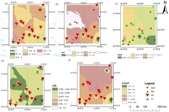 The spatial distributions of the Sen slopes for the trend analyses over the Enkangala Escarpment for the period 1972–2022, (a): Annual, (b): SON, (c): DJF, (d): MAM, (e): JJA. NSD denotes non-significant decrease, SD denotes significant decrease, NSI denotes non-significant increase, and SI denotes significant increase.