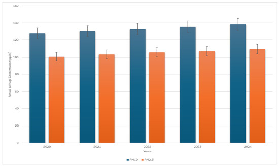Sampling was conducted at a height of 10 m in accordance with USEPA’s Quality Assurance Handbook for Air Pollution Measurement Systems, Volume IV: Meteorological Measurements (2017) [18]), which was intended to ensure the data’s comparability and minimize the interference from local ground-level disturbances. While a gradual increase in PM10 and PM2.5 levels was observed from 2020 to 2024, the overlapping standard errors between years suggest that some of the year-to-year fluctuations may not have been statistically significant.