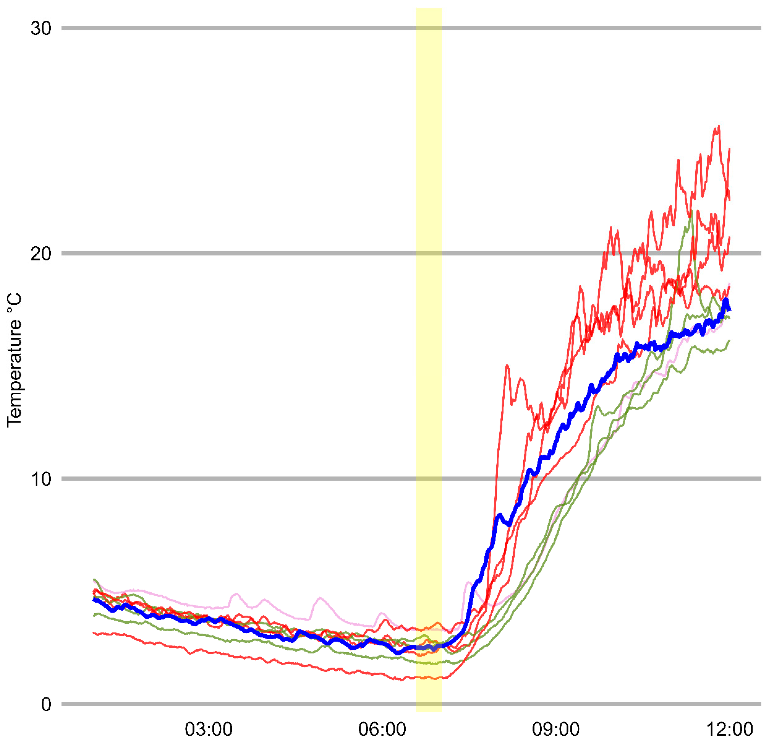 - Balchin, W.G.V.; Pye, N. Observations on local temperature variations and plant response. J. Ecol. 1950, 38, 345–353. [Google Scholar]