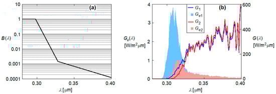 Both processes, atmospheric ozone absorption and aerosol extinction, impact the spectrum of UV radiation under clear sky conditions. Changes in the spectral distribution cannot be detected by common radiometric measurements/estimations in the UV band. Similar values of solar UV irradiance can result from the integration of a bluer (more short-wavelength photons) or redder (more long-wavelength photons) solar UV spectrum. Even if identical solar UV irradiances are measured, the different spectral distributions can induce different, even significantly different, efficiencies of various biological processes. Figure 1b illustrates this physical phenomenon. Thus, Figure 1b shows two synthetic solar UV spectra generated at the same atmospheric optical mass m = 3 but under different atmospheric conditions (see Section 3.2 for details about UV spectra generation). The first spectrum, G1(λ), was generated considering a small amount of ozone (lO3 = 0.25 cm·atm) in the atmosphere and a low loading of the atmosphere with fine aerosols (Ångström turbidity coefficient β = 0.03, Ångström exponent α = 2). For the generation of the second spectrum G2(λ), the atmosphere was considered to contain a large amount of ozone (lO3 = 0.55 cm·atm) and the same low loading with aerosols (β = 0.03) but with a predominant coarse mode (α = 0.2). Even though the difference between the spectra in Figure 1b is visible to the naked eye, the irradiances corresponding to the two spectra have the same value: . Figure 1b also shows the effective biological irradiances and , considering the erythemal action function (Figure 1a) and exposures to UV radiation with spectral characteristics G1(λ) and G2(λ), respectively. It can be seen that G1(λ) causes an erythemal action about four times greater than G2(λ), even if the same UV irradiances were to be measured.