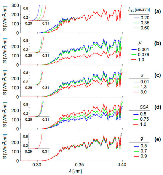 Synthetic UV spectra generated with SMARTS2, considering an atmospheric optical mass m = 3. The curve parameters are: (a) ozone column content lO3, (b) Ångström turbidity coefficient β, (c) Ångström exponent α, (d) single scattering albedo SSA, and (e) aerosol asymmetry factor g. The other atmospheric parameters were kept to the reference values. The inner windows focus on the wavelength range 0.29–0.31 µm.