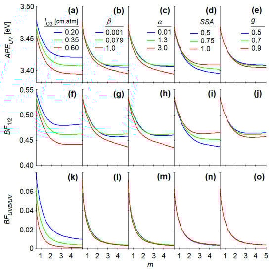 Variations in the UV spectral indices with respect to the atmospheric optical mass: (a–e) average photon energy APEUV, (f–j) blue fraction BF1/2 with in Equation (2), and (k–o) blue fraction BFUVB/UV with in Equation (2). The curve parameters are: (a,f,k) ozone column content lO3, (b,g,l) Ångström turbidity coefficient β, (c,h,m) Ångström exponent α, (d,i,n) single scattering albedo SSA, and (e,j,o) aerosol asymmetry factor g. The other atmospheric parameters were kept to the reference values.