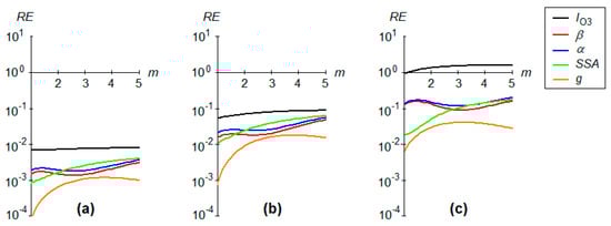 Figure 4 illustrates, in terms of RE, the sensitivity of APEUV, BF1/2, and BFUVB/UV with respect to the atmospheric optical mass m. The graphs overall confirm the observations related to the influence of different atmospheric parameters on the UV spectrum. Whatever the index, ozone determines its largest variation, and the aerosol asymmetry factor is the smallest. By far, the lowest sensitivity is shown by APEUV. The highest sensitivity is shown by BFUVB/UV. The difference in sensitivity from one index to another is approximately one order of magnitude: 10−3 for APEUV, 10−2 for BF1/2, and 10−1 for BFUVB/UV.