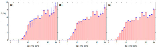 Mean percentage P[%] of the total UV irradiance evaluated in disjoint spectral bands of a 5 nm width each (solid bars). At the top of each bar, a boxplot indicates the spread of the percentages in each spectral band. The graphs are built based on spectra characterized by the following values of BFUVB/UV: (a) 0.005, (b) 0.015, and (c) 0.030.
