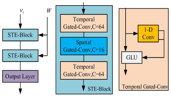 The STE consists of two spatiotemporal graph convolution blocks and a fully connected output layer. Each STE-Block contains two temporal Gated-Conv and one spatial Gated-Conv. The temporal Gated-Conv combines a 1-D Conv with a gated linear unit. In this study, we use STE to capture dynamic changes in air quality data over time and improve prediction performance.