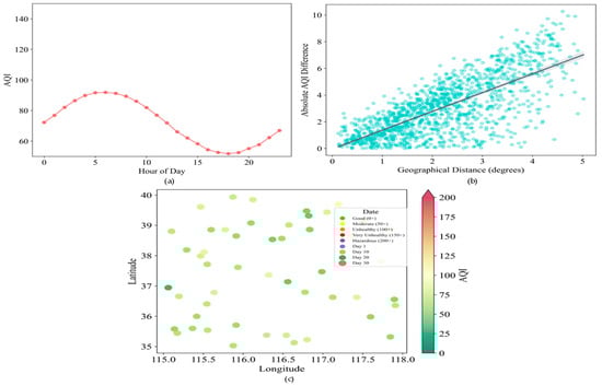 Architecture of an STE. (a): hourly average AQI; (b): distance vs. AQI difference; (c): spatiotemporal distribution of AQI.