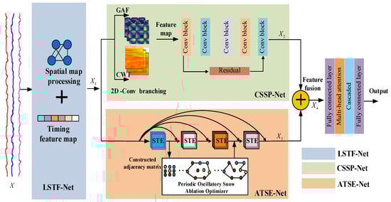 In general, the processing pipeline begins by feeding raw data X into the LSTF-Net preprocessing sub-network for spatiotemporal feature encoding. The generated fusion features are subsequently distributed through dual processing branches: the upper branch employs CSSP-Net, while the lower branch utilizes ATSE-Net, each specialized in extracting complementary dynamic spatiotemporal dependencies through parallel training. The learned features from both branches are then sequentially processed through three integration stages: feature fusion, a multi-attention mechanism layer, and a fully connected regression layer. Finally, the predicted values are generated through the output layer. The detailed procedure is described as follows.
