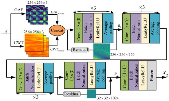 The upper half branch of CSST-AQP is CSSP-Net, which includes the GAF and CWT image coding module and a novel residual convolution module, whose structure is shown in Figure 5. The CSSP-Net first encodes into images with GAF and CWT. The encoded feature maps then pass through 11 convolutional layers and 2 residual blocks, extracting hierarchical multi-scale features and ultimately generating the output .