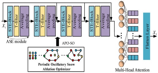To effectively capture the long-range time dependence, an adaptive time series region enhancement sub-network (ATSE-Net) is introduced into the lower branch of CSST-AQP. The detailed structure of the ATSE-Net is shown in Figure 6. The ATSE-Net architecture employs a hierarchically dense structure comprising four cascaded adaptive spatiotemporal encoding (ASE) blocks, followed by a multi-attention fusion module and a flattening output layer. Each ASE block integrates three core components: a STE unit for joint feature representation, an adaptive threshold filter (T-Filter) layer for dynamic sequence modeling, and an adaptive average pooling operator for dimensionality reduction.