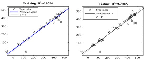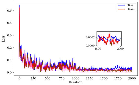 The raw dataset underwent comprehensive preprocessing procedures comprising outlier elimination through the interquartile range method, z-score standardization, and min–max normalization to ensure dimensional homogeneity. We convert all the time series data into samples and labels with the sliding window method (with a sliding window size of W and sliding step size of O) before putting them into the network model for training. After 2000 batches, the network stabilized with a loss function value of 0.0005, and the of training and testing reached more than 0.95. The results are shown in Figure 7 and Figure 8, respectively.