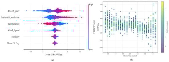 Visualization results for feature maps: (a) SHAP feature dependency graph; (b) temporal analysis of PM2.5.
