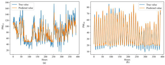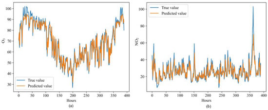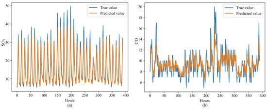 To validate the predictive performance of our proposed model, we conducted multi-step forecasts of six critical air pollutant concentrations (PM2.5, PM10, O3, NO2, SO2, and CO) over a 400 h horizon. The predictive outcomes are systematically presented in three comparative visualizations: Figure 12 demonstrates the PM2.5 and PM10 forecasts, Figure 13 illustrates the O3 and NO2 predictions, and Figure 14 displays the SO2 and CO projection results. Notably, all forecasted trajectories exhibit strong alignment with corresponding observed measurements across the evaluation period. The minimal deviation between predicted and actual values, particularly evident in the consistently narrow error margins, demonstrates the model’s effectiveness in capturing complex temporal patterns.
