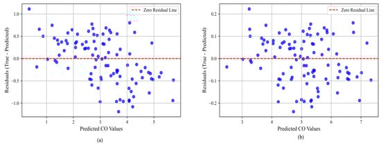 In Figure 11a, we can see that 4000 randomly sampled embeddings trained without spatial feature integration exhibit fragmented clustering across air quality ranges with weak inter-sample correlations (low correlation coefficients). Conversely, Figure 11b demonstrates that LSTF-Net’s architecture effectively organizes embeddings into distinct clusters with strong feature correlations following spatial–temporal learning. These empirical results confirm that LSTF-Net’s self-supervised framework significantly enhances feature discernment through synergistic spatial–temporal representation learning, directly contributing to improved prediction accuracy.