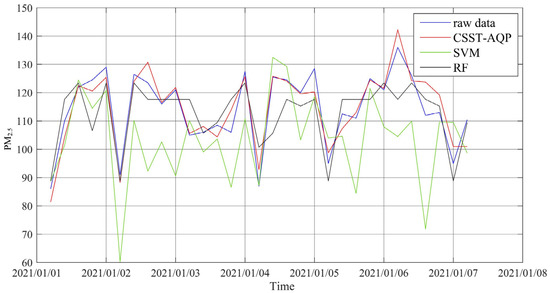 To further investigate the parameter sensitivity and robustness of the proposed CSST-AQP framework, we conducted experiments under the GZR dataset and the SGR dataset, respectively. Figure 19 demonstrates the prediction effect of the CSST-AQP model for the time range of 0–48 h for the GZR dataset, the SGR dataset, and the integration of the two datasets, respectively.