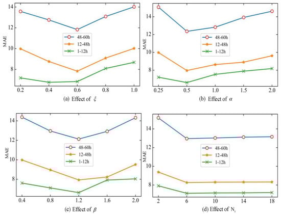 Figure 20 further illustrates the temporal evolution of prediction accuracy, demonstrating characteristic MAE variation patterns () across three operational phases: short-term (1–12 h), medium-term (12–48 h), and extended-term (48–60 h) AQI forecasting. Notably, the phase-dependent sensitivity profiles suggest that dynamic parameter dominance mechanisms’ ablation parameters (α/β) predominantly influence short-term predictions (R2 = 0.83), while attenuation coefficient shows a stronger correlation with medium-term accuracy. Overall, we can observe that the model is robust to small jumps in parameters, with the best performance at of 0.6, of 0.6, and of 1.2. The model achieves stable performance when the number of monitoring stations reaches 3 or more. In addition, attenuation coefficient plays an important role in LSTF-Net to extract highly correlated spatiotemporal features, which in turn affects the long-term prediction accuracy.