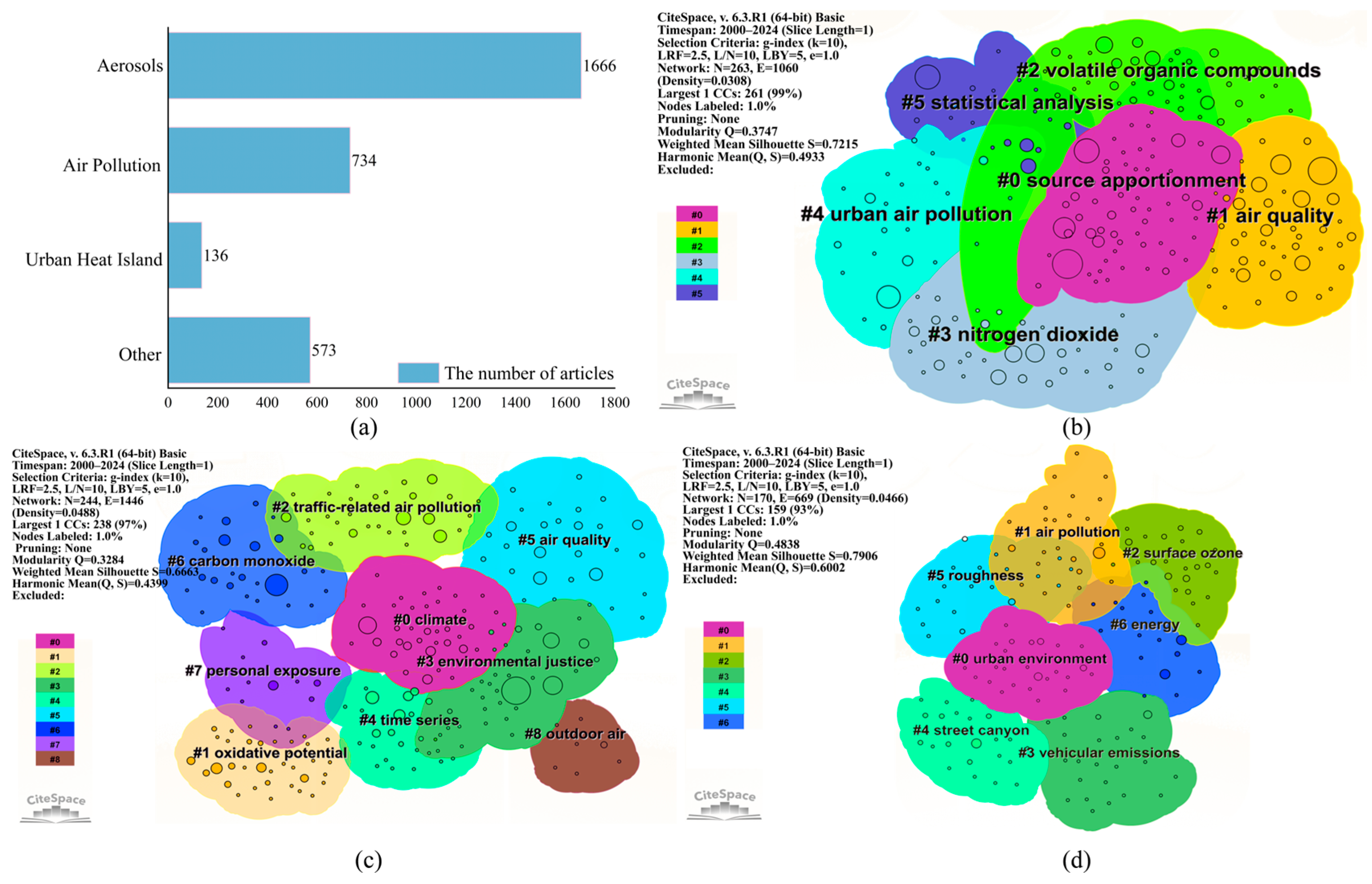 Figure 3c illustrates the clustering results for air pollution, highlighting key topics such as climate, oxidative potential, traffic-related air pollution, and environmental justice. For urban heat island research,