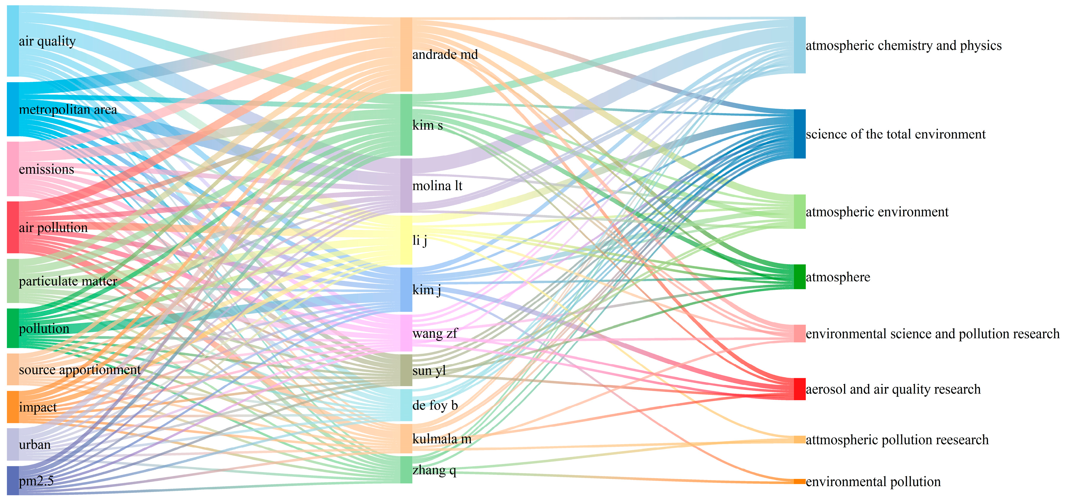The gray lines connecting these three columns reveal the flow of knowledge within the academic community, illustrating how specific research topics are explored by different scholars and disseminated through various scientific journals. This visualization provides a comprehensive overview of the field’s development, key contributors, and influential publication channels, offering valuable insights for researchers looking to navigate the landscape of air pollution studies. This Sankey diagram effectively illustrates the flow and connections between research topics, authors, and the journals in which their findings are published. By visualizing these relationships, the diagram highlights the diversity of scientific inquiry in air pollution research and reveals the intricate nature of interdisciplinary collaboration. This visualization not only exhibits the concentration of research efforts on key topics such as air quality, particulate matter, and emissions but also identifies influential scholars who drive progress in the field. The strong linkages between authors and specific journals further emphasize the preferred publication platforms for disseminating high-impact research.