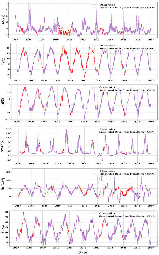 - The Transformer-CNN model performs best in simulating air temperature, relative humidity, wind speed, ground net radiation, and soil temperature. On the test dataset, the coefficients of determination for the interpolated results of Ta, RH, WS, SWC, Ts, and Rn were 0.97, 0.92, 0.97, 0.79, 0.93, and 0.98, respectively. These results underscore the model’s strong potential for meteorological data interpolation on the Qinghai-Tibet Plateau, though its effectiveness ultimately hinges on the complexity of the target elements and the quality and comprehensiveness of the input data.