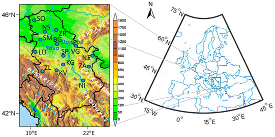 Location of meteorological stations in Serbia and position of Serbia in Europe.