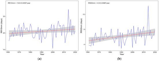 Extreme precipitation events: (a) RR10mm; (b) RR20mm, calculated as an areal average over Serbia (blue line). The straight line represents linear regression; the uncertainty is shaded.