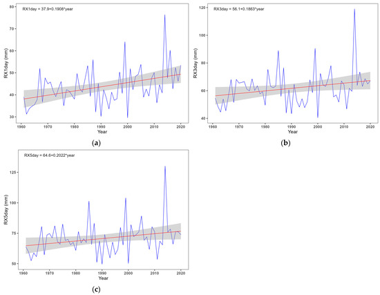 Extreme precipitation events: (a) RX1day; (b) RX3day; (c) RX5day, calculated as an areal average over Serbia (blue line). The straight line represents linear regression; the uncertainty is shaded.