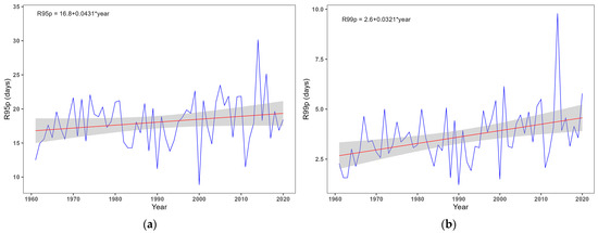 Extreme precipitation events: (a) R95p; (b) R99p, calculated as an areal average over Serbia (blue line). The straight line represents linear regression; the uncertainty is shaded.