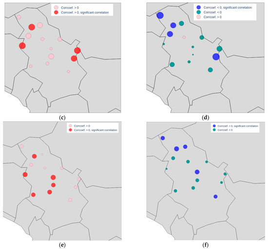 There is a more significant relationship between RR20mm and EAWR than for EA (Figure 5a,b). Similar but opposite values are found for RX1day (Figure 5c,d). The EA has a significant influence on R99p in eastern and central Serbia (Figure 5e), while EAWR has a significant influence from northern to southern Serbia (Figure 5f).