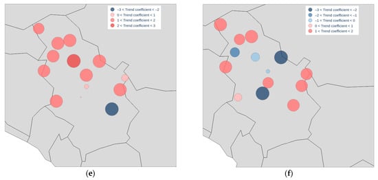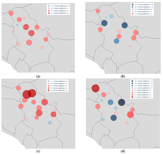 A more coherent trend pattern of selected indices is observed in summer, compared to winter (Figure 6). The highest number of stations with a negative trend is observed in the winter season (Table 8). In particular, the following stations show a negative trend: Sremska Mitrovica, Zrenjanin, Belgrade, Kraljevo, Veliko Gradište, and Zlatibor, mainly in central Serbia.