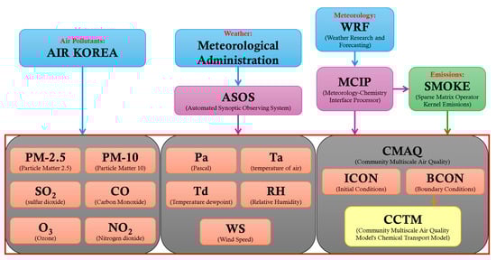 The input data consisted of air quality data, meteorological data, and model prediction data for Seoul from 2019 to 2023. As shown in Figure 1, the input dataset was structured as follows: air pollutant concentrations for six species (NO2, CO, SO2, O3, PM-10, and PM-2.5) were obtained from AirKorea https://www.airkorea.or.kr/web/ (accessed on 4 November 2024), while meteorological variables including pressure, temperature, dew point temperature, relative humidity, and wind speed were sourced from the ASOS (Automated Synoptic Observing System) dataset provided by the Korea Meteorological Administration’s Open Data Portal. Additionally, chemical transport model predictions from the CMAQ (Community Multiscale Air Quality Model’s Chemical Transport Model) dataset were used as simulated forecast data.