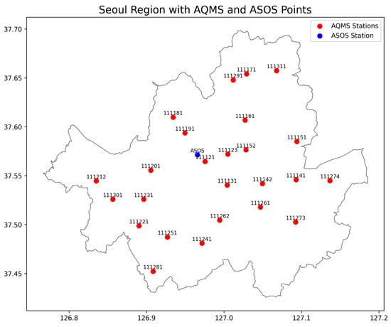 The air quality monitoring station data used to construct the Seoul input dataset are summarized in Figure 2. Since the number of ASOS stations is smaller than that of air quality monitoring stations, a matching process was required. The matching was performed using a distance function to pair each air quality monitoring station with its nearest ASOS station. All air quality monitoring stations in Seoul were successfully matched with a meteorological station in Seoul, and the ASOS code for this station is 108.