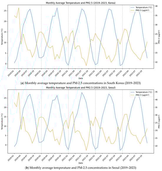 The monthly average temperature in South Korea exhibits distinct seasonal and monthly characteristics and patterns. Peak temperatures are consistently observed during the summer months (June to August), while the lowest temperatures occur in winter (December to February), reflecting a typical seasonal cycle. Similarly, the monthly average concentration of PM-2.5 demonstrates noticeable seasonal variations. PM-2.5 concentrations tend to rise during December and January, whereas relatively lower levels are observed from July to October. This seasonal trend is shown in Figure 3b, which illustrates that the Korean Peninsula possesses atmospheric characteristics marked by both seasonality and periodicity. Seoul shows similar temporal and seasonal patterns to the entire Korean Peninsula. Therefore, the missing data imputation method validated for the Seoul area is expected to be applicable to the Korean Peninsula as a whole and is likely to exhibit similar model performance in other regions with comparable monthly and seasonal patterns.