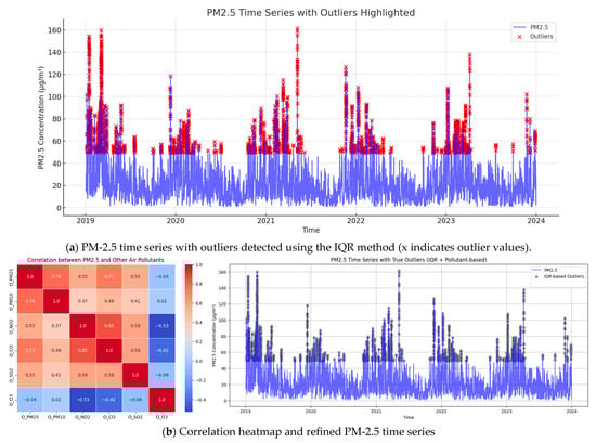 First, outlier detection was conducted using the interquartile range (IQR) method. Subsequently, a correlation analysis among air pollutants was employed to filter and refine the detected outliers. The IQR method defines outliers based on the first quartile (Q1) and the third quartile (Q3), using the following formula [14]: