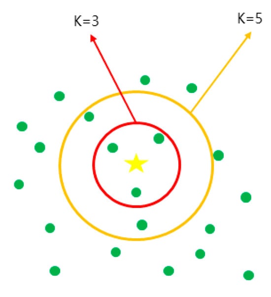 K-Nearest Neighbors (KNN) method: red circle for K = 3 and yellow circle for K = 5 green points represent known data samples, the yellow star indicates the target point to be imputed.