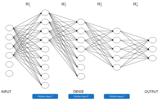The model architecture, illustrated in Figure 7, consists of an input layer, three hidden layers, and an output layer. For implementation, the Rectified Linear Unit (ReLU) function was used as the activation function in the hidden layers. The model was trained using the mean squared error (MSE) as the loss function, which is defined as follows: