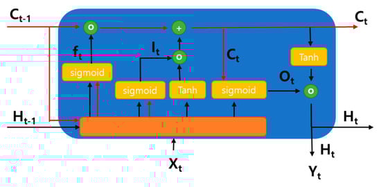 The basic structure of the model consists of an input gate (Equation (8)), forget gate (Equation (9)), cell state update and cell state (Equations (10) and (11)), and output gate and output (Equations (12) and (13)) as illustrated Figure 8. The equations are as follows: