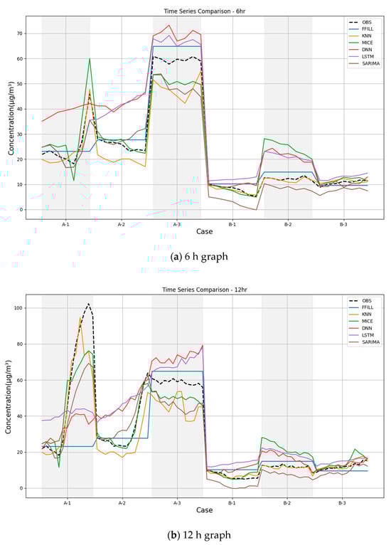 Moreover, actual missing data are more likely to occur continuously rather than in isolated one-hour gaps. Hence, this study evaluated the imputation performance under scenarios where continuous missing periods of 6 h, 12 h, and 24 h were introduced.