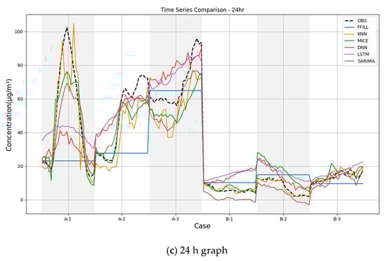 In summary, the analysis of the 12 h and 24 h missing intervals indicates that deep learning models were less effective in imputing missing data compared to statistical and machine learning-based methods. The factors that contributed to the limited performance of deep learning models in short-term imputation, such as inadequate hyperparameter tuning and instability under extreme concentration conditions, also appeared in longer imputation intervals, resulting in similarly limited effectiveness.