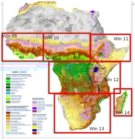 The GLC2000 map and 6 African domain windows considered for the BB emission inventories gaps (source https://forobs.jrc.ec.europa.eu/glc2000/data, accessed on 5 April 2025).