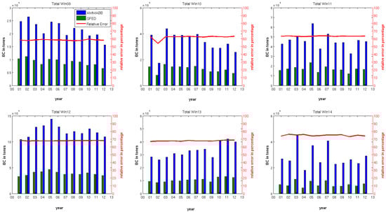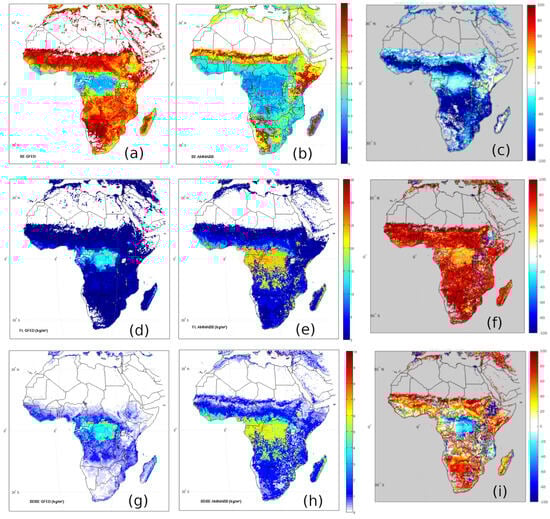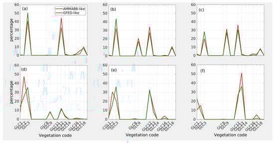 A summary of BEAMMABB/GFED ratios is provided in Table 1, revealing that these ratios vary from 0.350 (GLC 2: Tree cover Broadleaved deciduous Closed) to 1.923 (GLC 3: Tree cover Broadleaved deciduous Open). The spatial distribution of BDGFED, BDAMMABB, and their associated relative gaps in percentage (Figure 2d,e) showed significant differences. We found relative gaps above 60% almost everywhere except in the central part of Africa where these gaps are around 40%. This suggests that biomass density is more important in the AMMABB than in the GFED inventories. Table 1 revealed that BDAMMABB/GFED is between 0.207 (GLC 17: Mosaic Cropland/Tree Cover/Other Natural Vegetation) and 18.335 (GLC 2: Tree cover Broadleaved deciduous Closed). The product BE × BD is also known as fuel consumption and is referred to as “BEBD” hereafter. The spatial distribution of BEBDAMMABB, BEBDGFED, and their associated relative gaps is shown in Figure 2g–i. The only agreement between the fuel consumption values is found over the cultivated and managed area (GLC 16) with similar values of BEBD in both GFED and AMMABB (Table 1). The BEBDAMMABB are overall higher than BEBDGFED, from 1.795 for the Tree cover broadleaved Evergreen (GLC 1) to 9.189 for the Tree Cover, regularly flooded, saline water (GLC 8) vegetation classes. The spatial distribution of the relative gaps (Figure 2i) showed that over the Sahel (Win09) and the southern part of Africa (Win13), relative gaps are positive and higher than 60%. Negative relative gaps of more than 70% are observed over central Africa (Win12) and the Horn of Africa, i.e., from Ethiopia (Win11) to northern Kenya (Win12). This points out that the differences between GFED and AMMABB vegetation parameters need to be investigated for each vegetation type, and their contribution to total emissions assessed.