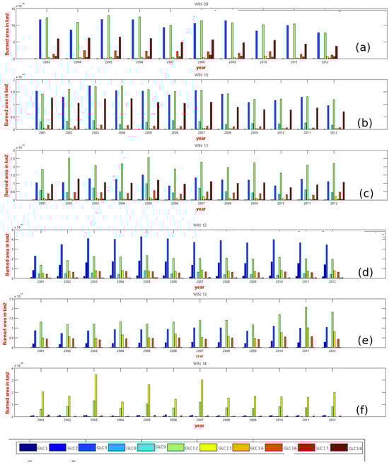Yearly burned vegetation variability over sub-Saharan Africa between 2001 and 2012, for the relevant GLC classes (GLC1 (Tr. cov. broad. ever.), GLC2 (Tr. cov. Broad. Decid. closed), GLC3 (Tr. cov. Broad. Decid. open), GLC8 (Tr. Cov. Reg. Flood. Sal. Wat), GLC9 (Mos. Tr. Cov./Oth. Nat. Veget.), GLC12 (Shr. Cov. Closed-open, decid.), GLC13 (Herb. Cov. Closed-open), GLC14 (Spar. Herb./spar. Shr. Cov), GLC16 (Cult. And man. areas), GLC17 (Mos. Crop./Tr. Cov./Oth. Nat.Veget.) and GLC18 (Mos. Crop./Shr. Grass Cov.)) and MODIS windows (a) Win09; (b) Win 10; (c) Win 11; (d) Win 12; (e) Win 13 and (f) Win 14 as defined in Figure 1. Subplots use different scales for clarity.