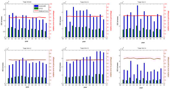 Spatial distribution of mean OC emissions (tons/cell) at spatial resolution of 0.25° × 0.25° in “AMMABB-like” (first column), “GFED-like” (second column), their differences (third column), their relative gaps (fourth column) over Win09 (a–d), Win10 (e–h), Win11 (i–l), Win12 (m–p), Win13 (q–t) and Win14 (u–x) of the sub-Saharan Africa domains of the collection 5 MODIS burned areas data.