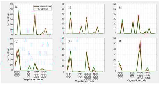 Vegetation classes contribution to BC emissions for each sub-Saharan Africa domain of the collection 5 MODIS burned areas. (a) Win09, (b) Win10, (c) Win11, (d) Win12, (e) Win13 and (f) Win14 as shown in Figure 1.
