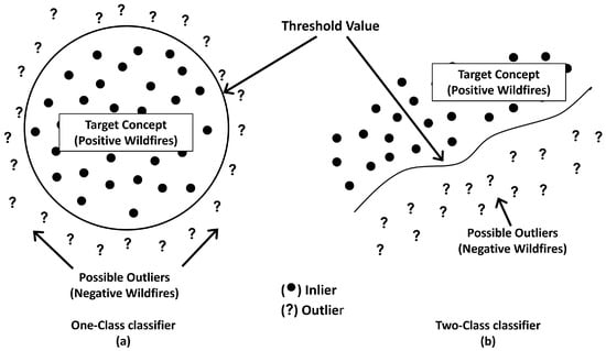 In one-class classification, the model assigns a data point as an inlier (•) if its probability exceeds the chosen threshold. Conversely, if the probability is below the threshold, the data point is classified as an outlier (?), as illustrated in Figure 1a. The selection of an accurate threshold is crucial to ensure the correct classification of inliers and outliers. Typically, the classification boundary in one-class learning is designed to accept most positive data labels while rejecting only a minimal number of outliers, as shown in Figure 1b. During training, the model relies exclusively on positive data labels, treating outliers as negative labels or non-fire events [,].