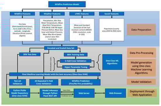 The input data are meticulously categorized into four groups: wildfire characteristics, weather-related attributes, Live Fuel Moisture Content (LFMC) indicators, and social factors. The dataset undergoes comprehensive pre-processing, including encoding and scaling, to ensure the robustness of the ML models using one-class classification. A detailed explanation of these thorough pre-processing steps follows, instilling confidence in the model’s robustness.