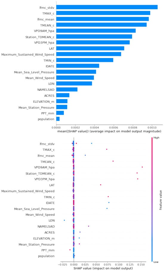 The Shapley value is a metric used to determine the average marginal contribution of each feature when considering all possible combinations (coalitions) of features []. For example, to calculate the Shapley value of the mean wind speed, one must evaluate all possible coalitions of features that include or exclude the mean wind speed. Each coalition’s marginal contribution of the mean wind speed to the target variable (e.g., ignition probability) is assessed. By aggregating these marginal contributions across all coalitions, the mean marginal contribution of the mean wind speed is obtained, representing its Shapley value.