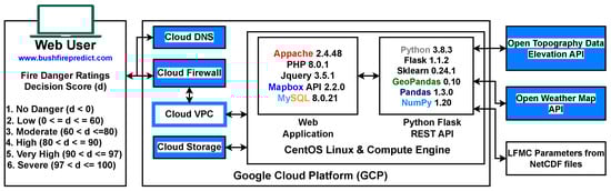The ML model processes 20 input variables (refer to Section 4) from four key categories and six probability-based fire risk levels. These levels are defined by the decision scores (d) assigned by the one-class ML models. The six levels are as follows: No Danger (d ≤ 0), Low (0 < d ≤ 60), Moderate (60 < d ≤ 80), High (80 < d ≤ 90), Very High (90 < d ≤ 97), and Severe (97 < d ≤ 100). Each level represents a different degree of fire risk, with ‘No Danger’ indicating no immediate threat and ‘Severe’ indicating an imminent or ongoing fire. The classification of these fire risk levels aligns with the fire spread probability estimates used in the US Wildland Fire Decision Support System []. Historical wildfire risk assessments, as documented in [], inform the chosen threshold values for the fire danger rating levels, which are significant as they determine the severity of the predicted fire risk. The Flask-based REST API for the web application interacts with three additional external REST APIs to facilitate wildfire prediction:
