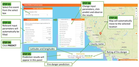 Users can access wildfire prediction capabilities through the website www.bushfire-predict.com, accessed on 8 April 2025. This online tool facilitates fire predictions in California and Western Australia for any specified location within these regions as shown in Figure 5. Users can select locations from a heatmap to forecast wildfires up to one week in advance. Furthermore, historical wildfire events can be examined using specific past incidents. ML models generate prediction results, offering both manual and automatic search options. Predictions are displayed with positive or negative labels indicating potential wildfire occurrences or the absence thereof. Additionally, potential wildfires are categorized into fire danger rating classes, ranging from No Danger to Severe levels.