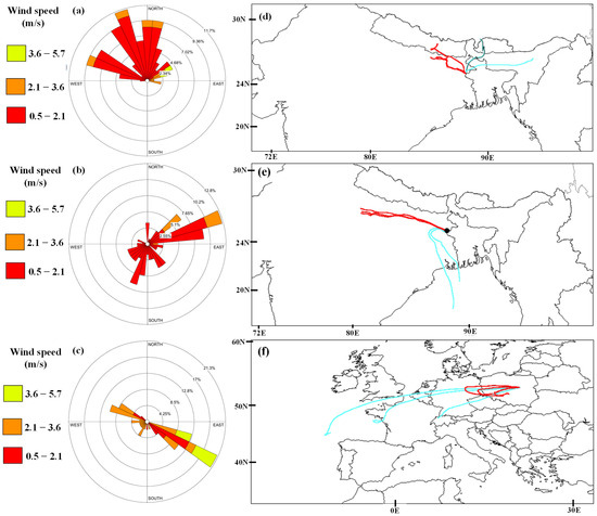 A wind-rose diagram showing the distribution of wind speed and wind direction during festive celebrations in (a) Malda, 2023, (b) Malda, 2024, and (c) Warsaw, 2024. The HYSPLIT was used to generate 72 h backward trajectories at various altitudes above ground level (AGL) for the sampling period, highlighting the origin of air pollutants at the study site, as well as (d) Malda, 2023, (e) Malda, 2024, and (f) Warsaw, 2024 during festive celebrations. The backward trajectories indicate the backwards path of an air sample to determine its origin and understand the influence of different sources on air quality. The air-mass back trajectory was downloaded using https://www.ready.noaa.gov/HYSPLIT.php (accessed on 18 January 2025). The distinct source regions are represented by different lines (red- and blue-colored), revealing the complex interplay between various emission sources at the study site.